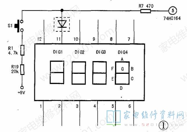 拆机后检查,“减”键相当灵敏,与该键相连接的电阻及铜箔也未见异常。根据实物测绘发现,“减"键S1回路与数码管11脚相连(相关电路见图1), 此机4位数码管(共阴)及键控电路,采用74HC164芯片控制,再经排线送到主板CPU。初步怀疑74HC164芯片损坏,换新后故障依旧。