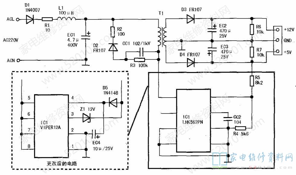 将外接模块输出的+5V、+12V电源接入电脑板后通电试机,整机各功能运转正常,但+12V电压下降为+10V,说明+12V回路输出电流不足。若长期使用,恐怕电源板不耐用。考虑到T1正常,同时受到外接模块的启发,于是利用VIPER12A电源块,将图1实线框中电路改成虚框中电路。虚框内的D5、Z1、EC4等元件搭接在IC1相应引脚上,然后引出三根线接入电路,通电试机,+5V、+12V输出电压稳定如初,风扇正常运转。