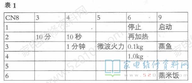 把微波炉面板取下,从面板上再把薄膜键盘取下,薄膜键盘是通过不干胶粘在面板上的,取时要小心。接着再分离开薄膜键盘,将印刷薄膜电路取出。根据面板上各键的定义结合印刷薄膜电路,统计出CN8各脚相互短接的命令组合,见表1。
