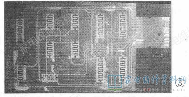 用万用表测量印刷薄膜电路各按键点到导电橡胶接触点,均已不通。逐步缩小测量范围,最后确定断点在印刷薄膜电路与导电橡胶接触的附近弯曲的地方。拿出半个月前修理笔记本键盘购买的导电银浆,小心涂在印刷电路断点处。放了几个小时晾干,用万用表再次测量各按键点和导电橡胶连接处均已导通。将键盘、面板恢复后,微波炉正常工作。至此修复工作完成(见图3)。