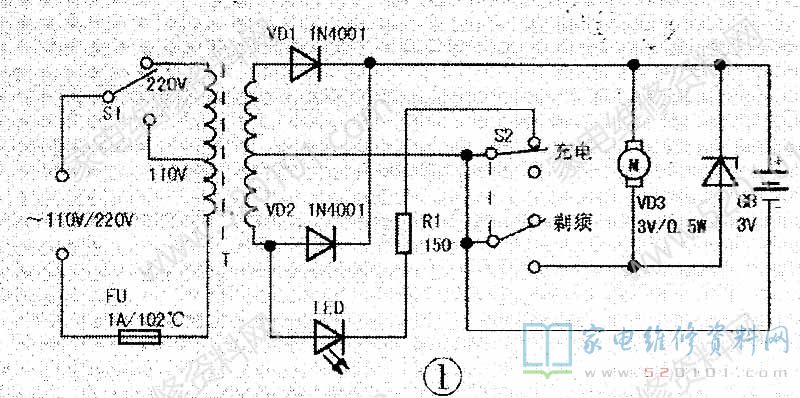 电机支路有故障:(1)S2“剃须"位置接触不良致电机无电;(2)保护稳压管VD3(3V/0.5W)击穿短路或漏电,此时FU可能会烧断;(3)电机M本身有故障,正常时,各绕组的直流电阻应相等,由于电机相邻两整流端子测得的电阻值,应该是被测绕组和另外两个绕组串联后再并联在一起的数值,例如每绕组正常时为60Ω,实测相邻整流端子间的阻值应为400[60x(60+60)]/[60+(60+60)]。若实测阻值为120Ω说明被测绕组开路,而另外两个绕组正常。若实测阳值小于40Ω甚至为0Ω,说明被测绕组短路或漏电这往往是整流端子间绝缘间隙短路,可用小刀刮千清刷干净间隙内的污垢和碳屑(碳刷磨损导致),再用清洗剂轻刷干净即可恢复正常。