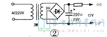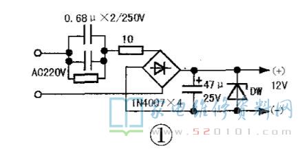 这是一款直接采用由220V市电,经电容降压,桥式整流、滤波,再经DW稳压,输出12V的直流电源。检查发现降压用并联的C1.C2 (均为0.68uF、耐压250V)其电一个烧崩。DW.C3失效。我觉得此故障可能是降压电容耐压不够引起的。再购同种元件有所担心,换所有损坏元件也不合算。故用图2所示电路代之。