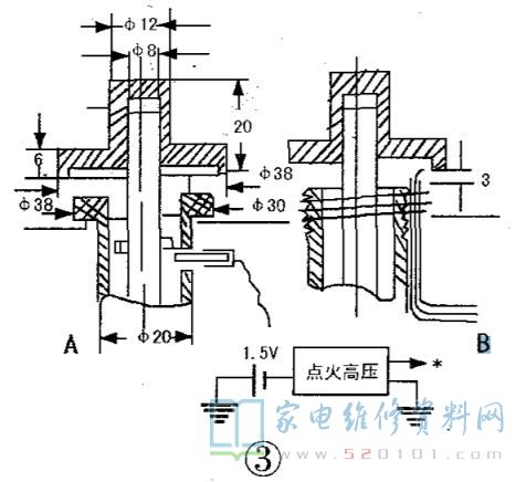 该炉灶共有两个火眼。压下煤气调节控制开关,反时针旋转,电子打火开始放电打火,煤气开始逐渐加大,直至点火完成,放松开关放电停止。但其中一个却不能放电打火。其结构原理如图3A所示,要换这部分,人工、材料很贵。解决方法有两个:(1)将两条连线相并联,由一个开关控制,但要两只手操作,才能完成,很不方便。(2)如图3B所示。