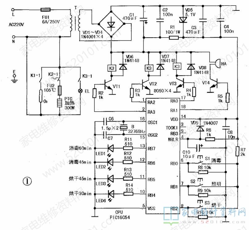 故障现象1:接通电源,按各手动操作键均无效,蜂鸣器不响,各指示灯也不亮。分析检修:此现象表明消毒柜整机未工作,主要原因如下:(1)电源供电失常。该电源将220V市电分成两路:一路经保险FW1后,分别为臭氧消毒器O3;PTC (正温度系数)加热元件和照明灯EL供电;另一路经电源变压器 T降压,VD1~VD4全桥整流后获12V 左右直流电压,为继电器K1~K3及压电陶瓷蜂鸣器HA供电;同时经电阻R1(100Ω/1W )限流后,由VD5稳定在5V左右,为CPU及控制电路供电。C1、C3为电源低频去耦滤波电容,C2、C4为高频干扰吸收电容。若测得CPU 14、⑤脚间无5V工作电压或电压过低,可能是FU1熔断,T初级或次级绕组断线(正常电阻值分别为8Ω和1.8Ω), VD1~VD4或R1开路失效,C1~C4或VD5击穿漏电;(2)复位电路有故障。