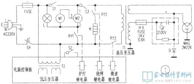 当设定微波加热时,IC1 15脚输出微波控制信号,经R17使Q4导通,微波继电器RY3吸合,接通低压电路(见图1),220V市电加至T1,MAG发射微波加热食物。拆开按键板外壳,拔出按键板连接器的锁定键,拆下电脑控制板,检查上述电路各元器件未发现异常,遂拔出S2插接件(S2安装在炉腔右侧),关闭炉门,用万用表测S2时通时不通,由此确认,S2接触不良造成微波控制电路不能正常工作引起所述故障。拆下S2,撬开外盖,用细砂纸打磨两触点黑色氧化物,然后将S2嵌回原处,插好插线件,通电试机,微波炉一切正常,故障排除。