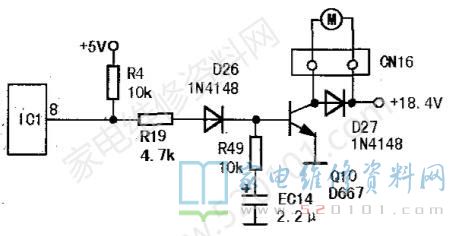 一台美的牌MC-EF197型电磁炉,加热一段时间后,自动关机并报警。根据故障现象分析,多是风扇电机本身损坏或风扇驱动电路相关元件损坏引起的。检修时,先拔出风扇电机M插头,外接12V~18V直流电源,风扇正常运转,可见故障出在风扇驱动电路,实绘风扇驱动电路如图1所示。