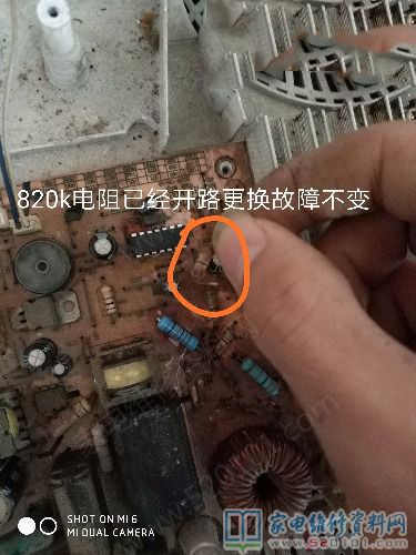 早上一客户送来一台美的EP208电磁炉,说不能加热,上电开机,能加热但是加热三秒钟这样就不加热了,就是断间加热。拆板出来。觉得5v、18v、300v不用想一定有,就没测,把大电阻拆开一个个测。后来发现820k的电阻已经开路了。这时就很开心的换上去。