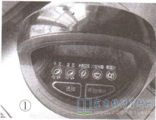 接修一台美的DJ12B-DSJ2豆浆机,开机后机器能正常加热,但加热一段时间后面板.上的“干豆”、“湿豆”、“米香豆浆”、“八宝/米糊”和“果蔬汁”5个指示灯均闪烁,如图1所示,并伴有“嘀嘀”的蜂鸣音。分析检修:根据该机的工作流程看,加热一段时间后就进入打浆状态,该机在此时停止运行,怀疑本机的温控功能失灵,不能有效地进行温度控制,导致电机不运转,不能打浆;同时,继续加热,导致机内温度过高,整机进入保护状态。