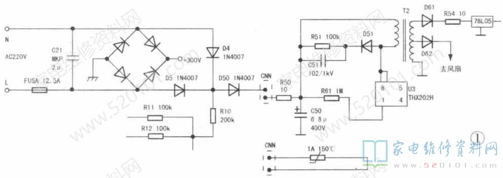 实测U3⑧脚无300V直流电压,C50正极和R50两端均无300V,而D50两端却有电压,由此看来,其故障部位应在D50与R50之间的插件CNN上,通过观察发现,该机的上盖板用的是类似于光波炉用的红外盖板,盖板内侧的四周(对应线盘的位置呈正方形的四边)有一扁金属条框,用塑料卡固定,在其内侧的左,上角有一斜拉塑料板条,在塑料板条与盖板之间放入CNN的插件连接物(用胶固定并紧贴上盖板),用万用表测量呈开路状态。小心地将其抠下后看到其形状酷似常见的瓷片电容,小心刮去上面的涂胶,见上面写有1A/150°C字样。看来此物件就是一只1A电流、温度为150°C的保险,一旦电路过流或超温便会熔断,使电路保护。换上一只参数相同的保险后试机,故障排除。