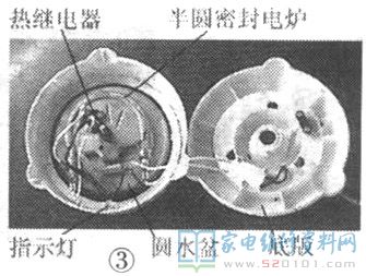 这个煮蛋器的样式新颖美观,结构合理巧妙,在外表看不出有安装螺钉,找了好久,终于发现它安装的巧妙处,在煮蛋器底部中间有一块圆形的卡扣式螺栓盖板。于是试着在盖板中间用钻头钻了一个孔,然后用改锥把它撬了出来,见图4右上角。煮蛋器上、下两个部分的结合只靠其底部中间一个螺栓来固定,不会出现丝毫的松动现象,这又是它结构的一大特点。根据使用说明,可通过空载实测其性能与好坏,即不加水接通电源,开始时红灯亮,当温度达到一定时热继电器断开,绿灯亮,说明控制电路完好,否则予以掉换。