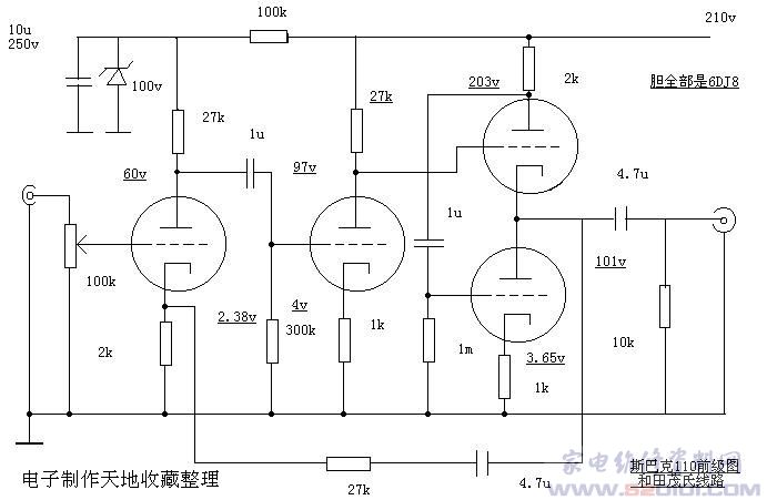 此线路和原来发表的和田茂氏线路有点不同,最前的一级多了一个100V的稳压管主要是6DJ8的工作电压决定的,多了个稳压管以保证电压波动时电路也能安定可靠的工作,最主要的是在输出上的区别,按原图制作时输出端会有直流电位输出,在使用上有许多不便。少了一个电容可能声音会好些。声音好?也要注意到器材的安全。下图是原和田茂氏线路图。此线路可按上图改进在输出端加上一个输出电容。大家可作比较。