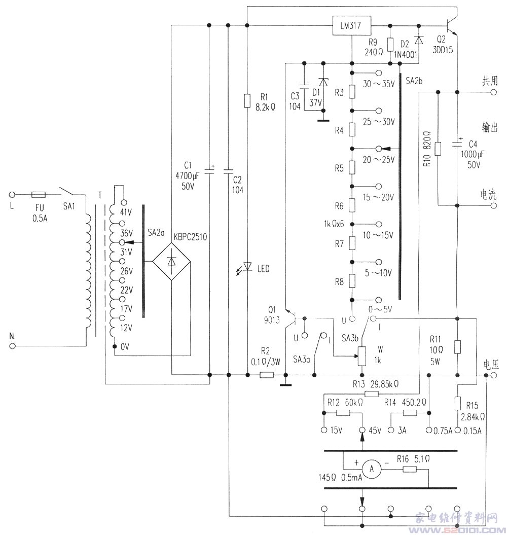 交流电源经T降压,整流、滤波后供给可调集成稳压器LM317。恒压输出时:电压分0-5-10-15-20-25-30-35V共七挡,由开关SA2进行粗调,W进行细调,R3~R8为分压电阻。恒流输出时:将电流经过R11的压降作为取样信号,由W调节控制Q1的导通,Q1的C极接LM317的调整端,控制LM317的输出电压以达到恒流的目的。无论恒压或恒流输出,W的活动臂都是向下输出加大,反之减小。输出有三只接线柱,其中一只为共用,另外两只分别为恒压输出与恒流输出。由于LM317本身输出电流较小,在这里用一只3DD15进行扩流。输出端的指示由SA4进.行转换(0~15~45V,0~0.15A~0.75A~3A)。恒流电流I为0.5A(取样电阻10Ω、电压5V),若想加大恒流电流I只需在电压输出端和电流输出端之间接一电阻R(R=5/I)即可。输出指示为一只500μA的85C1表头(内阻加附加电阻为150Ω)。SA3为恒压恒流转换开关。