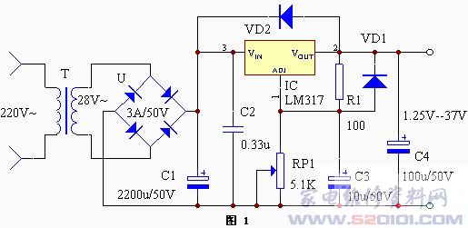 这是一种输出电压连续可调的集成稳压电源,输出电压在1.25-37V之间连续可调,输出最大电流可达1.5A。电路简单,很适宜电子爱好者自制,可用于各种小电器供电。