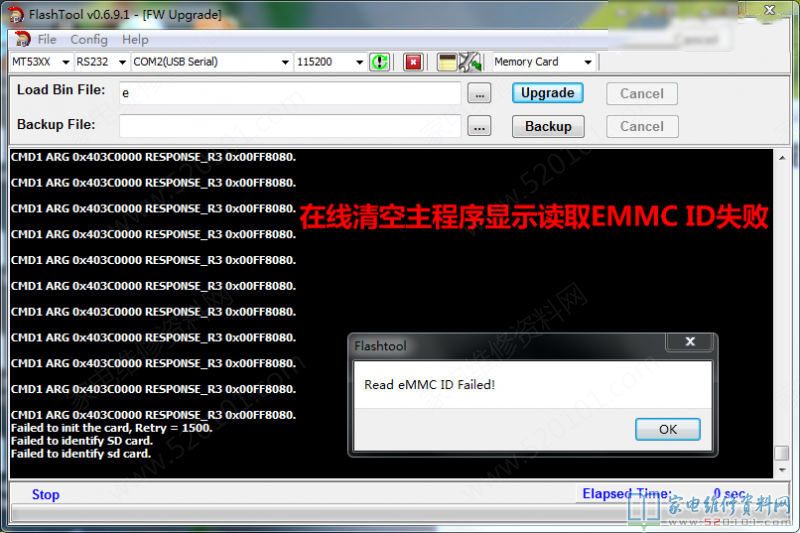一同行拿来一块海信液晶电视LED58K280J主板,原装故障是背光亮无图像,他用U盘升级了一下直接不开机了。通电试了下指示灯亮按遥控无反应,用编程器接主板VGA口也无打印信息输出,准备清空EMMC程序写引导提示Read eMMC ID Failed(读取EMMC ID失败),直接写引导也是这个错误提示。