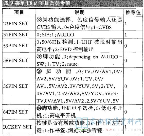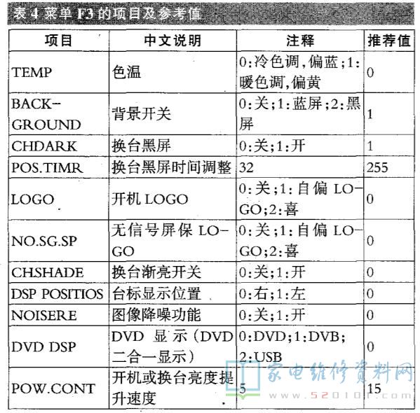 按上述方法进人工厂调试菜单F1后,其项目与参考值见表2,这时按静音键可打开菜单F2,见表3。