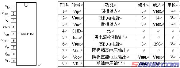 TDA6111Q是具有16MHZ带宽的视频输出放大器,有防止CRT打火保护功能、暗电流检测输出自稳定功能、直流和瞬态电流两种阴级输出通道、ESD防静电保护功能(注:Electric discharge Sensitive Device:易受静电损坏器件)。注意:IC第6脚VDDH高供电电压应限制在180V到210V之间,以确保打火期间VDDH不会超过最大电压250V,该脚需要接容量在20nF以上的优质高频电容到第4脚GND,电容应严格紧靠在4,6脚之间(5mm内);第2脚低供电电压VDDL最大值为14V,该脚需要接容量在20nF以上的优质高频电容到第4脚GND,电容应严格紧靠在2,4脚之间(10mm内)。