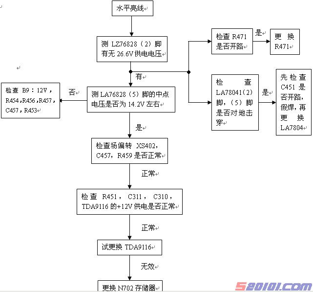 注:对于水平亮线还要注意C453是否漏电;对于场线性不良要注意C453,C456,R457,R455,R459组成的电压电流交直流负反馈网络和TDA9116部分的C311,C310的容量,R451阻值的大小也要注意。