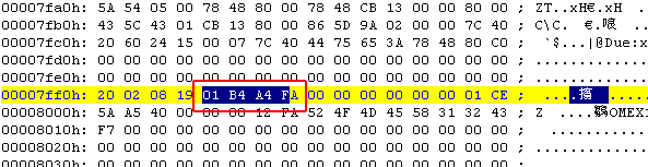四、由于保护卡模块中还需要与串行芯片中的卡号相对应,因此,我们还需要修改27C512文件。运行16进制编辑软件(UltraEdit)打开下载保护卡模块27C512-HY.BIN文件。寻找地址07FF0,找到后将此行从第五个字节开始的四个字节修改为(上面提供的卡号):01 B4 A4 FA,修改完成后保存即可。