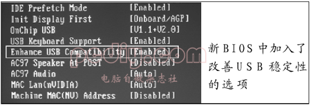 5、升级主板的BIOS,这一点也很重要。EPoX的8RDA+的最新版BIOS改善了USB接口的兼容性与稳定性,新增了“Enhance USB Compatibility”选项,建议设为Enabled。