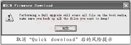 升级程序主界面的“Version”框中直观地显示了MP3播放器当前的Firmware版本号以及准备升级的版本号。点击“Show details”按钮可以显示Firmware的更多信息。我们可以看到在“Download options”框中有一个“Quick download”选项,我们一定要将此项选中,否则在升级Firmware时,会将MP3播放器的开机引导部分程序也进行刷新(相当于主板BIOS中的引导块),这样刷写Firmware的风险就会大大增加。