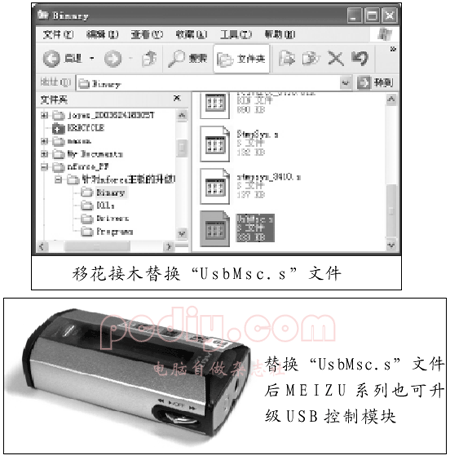 如果仅仅为了解决播放器与nForce2主板之间的兼容性问题,我们完全不必升级整个Firmware模块,而只需要升级USB通讯控制部分的软件模块,这样就不会出现控制错误等问题了。升级软件的“Binary”目录下的“UsbMsc.s”文件就是USB通讯控制模块,我们将此文件覆盖其它品牌MP3播放器附带升级软件中的同名文件,然后我们按照上文所讲述的步骤进行升级即可。