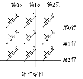 通常使用的键盘是矩阵结构的。矩阵式键盘是指键开关按行列排列,形成二维矩阵的结构,如8×8,4×4等,是常用的一种键盘结构。对于8×8=64个键的键盘,采用矩阵方式就只要用16条引线和2个8位端口便完成键盘的连 接。如图为3×3=9个键的阵列,这个矩阵分为3行3列,如果键4按下,则第 l行和第 l列线接通而形成通路。如果第 l行线接地电 位,则由于键4的闭合,会使第 l列线也输出地电位。矩阵式键盘工作时,就是按行线和列线的电平来识别闭合键的。