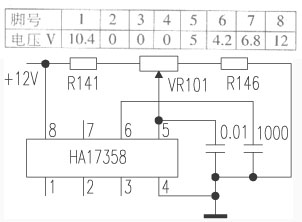 检查该电位器(VR101,1kΩ)正常。测量动触点电压,始终为0V,如图。12V经过R141、VR101、R146到地,从VR101的动触点分压出来的不同电压,加到HA17358{5}端控制行频。HA17358工作正常时的各脚电压如附表。正常时用万用表测{6}脚电压,当行频下降没有信号输入时,{6}脚电压为3.0V。此时测{6}、{7}脚电压均不正常,也没有反应。不加电时测得{5}脚对地电阻太小,而拆下发现{5}脚对{4}脚阻值正常,结果查得{5}脚外围的一个瓷片电容(0.01μF)漏电。换一只好的电容后开机重调VR101,同步正常,故障排除。
