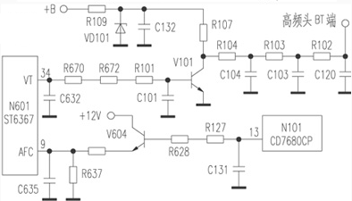 用手动搜索到图像及伴音正常时,监测高频头BT端调谐电压逐渐升高,此时图像及伴音质量变差至消失。测VD101负极电压为31.2V且稳定;测V101 c、b极电压,均有波动。监测CPU{34}脚输出的调谐控制信号(脉宽调制信号)电压,发现在其半分钟内就下降达0.1V,表明故障系CPU输出的...