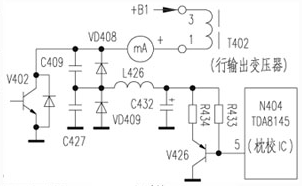 该机转我处维修时,据说曾损坏过三只行管。经观察,行振荡电路、行AFC电路已被检修过,看来前修理者可能将该故障定为行频偏低,而走入歧途。 由于荧屏能出现正常画面,说明行频并不偏低,显然“吱吱”声应来自开关电源,经查,开机瞬间+B输出电压为130V(正常值112V),然后逐渐降至110V左右...