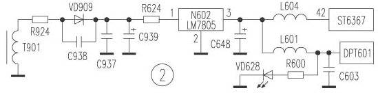 电源指示灯的电源是由开关电源+15V电源端提供的,相关电路图见图2。检测三端稳压块N602(LM7805){1}、{3}脚电压均为0V,检测C939正极有+14V左右的电压,说明限流电阻R624(10Ω、1/2W)开路。更换R624后,故障排除。...