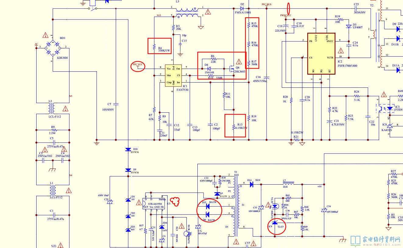 接修一台创维37寸液晶电视,型号是37M11HM,故障表现是不通电,经查只烧了保险和PFC管K3683,更换后测得PFC电源为450V,偏高,这个显然不正常,查取样电阻发现R17变大为670K,电阻丝印为560K,更换后PFC电压正常,机器修复。
