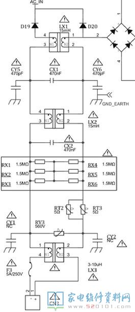 如图7所示,F3是保险丝,市电经市电经由F3、LX3、RV3、RT2、RT3、CX2、LX2、CY5、 CY6、CX1、LX1、BD1等组成的整流滤波电路后转变成脉动直流,EMI滤波器的作用主要是防 止外界的杂讯信号对电源的干扰以及电源的开关杂讯对电网产生的干扰。