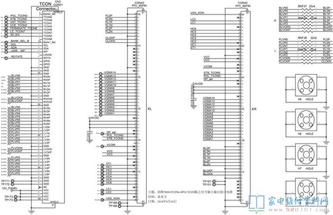 对于“黑屏”故障,首先确认主板送到TCON板的LVDS信号为正常,然后依次检查TCON板上的VIN、VCC、VGL、DCOUT、RESETB、AVDD、VGH等供电或信号输出到相应电路是否正常,接着检查电平移相(转换)、伽玛校正电路是否正常,最后考虑屏体驱动电路是否损坏。