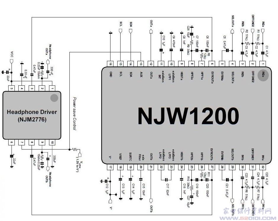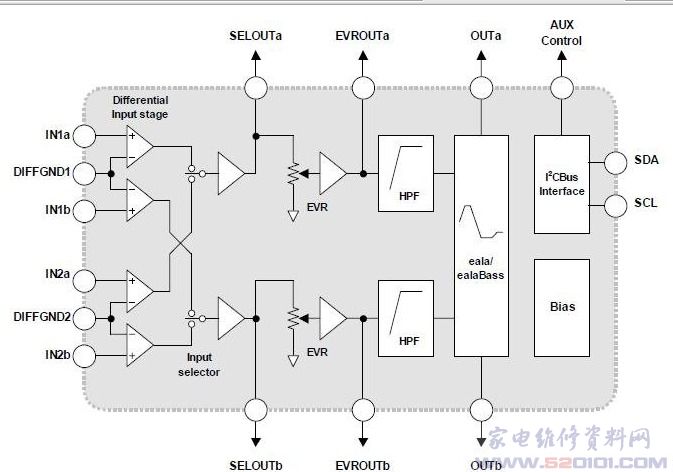 它由高的共模抑制比CMRR(Common Mode Rejection Ratio)差分输入选择电路、低噪音/低失真电子调音器电路及“eala”、“eala BASS”等高性能的模拟电路构成,对电路的性能要求较高。