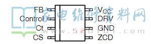 中文引脚说明:①脚:FB,稳压反馈端,内接2.5V基准比较器,同时也是OVP和UVP保护端,当此脚电压高于2.6V或低于0.3V时,IC将启动保护而停止工作。②脚:Ctrl,误差放大输出端,此脚外接电容建立电压调整驱动输出脉宽。③脚:驱动脉冲开关定时控制端,外接振荡电容。④脚:CS,开关管工作电流检测端,此脚电压高于0.5V将关闭驱动。⑤脚:ZCD,过零检测端。⑥脚:地。⑦脚:驱动输出端。⑧脚:VCC,此脚正常工作电压为12V,若低于9.5V,IC停止工作。