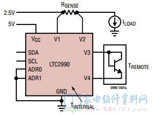 LTC2990 的准确度是采用普通型 14 位 ADC 获得的,而内置 10ppm/C 电压基准则最大限度地缩减了所需的支持组件数目和占板面积。此外,I2C 串行接口还实现了器件的控制、状态和数据寄存器的简易型配置和回读,并在I2C 快速模式中支持高达 400kbps 的数据速率。