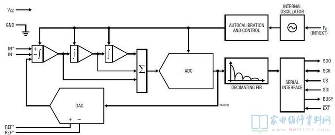 该ADC可在±2.5V输入范围(200nVRMS)提供2,500万刻度或在±50mV输入范围提供50万刻度(与感应器偏置/清零电压无关),具有极低的噪声,可以无需复杂的可编程增益放大器(PGA)。由于它的准确性(5ppm INL,1ppm偏置,10ppm满量程,都与输出速率无关)与灵活的输入范围(共模输入的GND对VCC与VREF无关),极大简化了模拟前端电路。