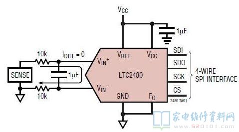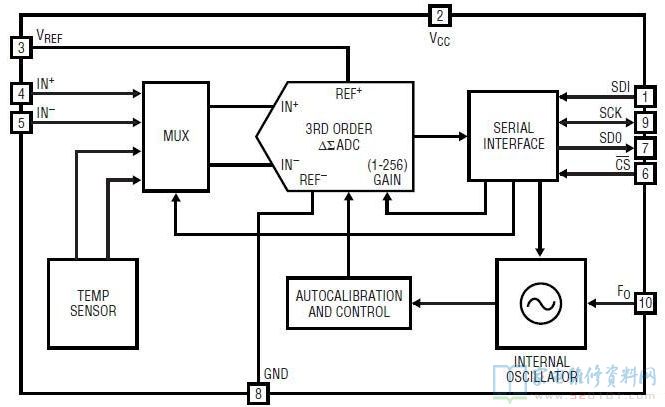 概述:LTC2480采用纤巧型(3mmx3mm)10引脚DFN封装和10引脚MSOP封装。为增量累加模数转换器。能够直接数字化多种传感器。Easy Drive技术使差分输入电流平均为零,简化了前端信号调节电路的设计,并允许用电桥、RTD、热电耦和其它高阻抗传感器直接驱动ADC。不用内部缓冲器而直接准确测量高阻抗输入电源的器件,去除了片上缓冲的缺点。具有大的时间常数的外部RC网络可以直接放置在高分辨率Δ∑ADC之前而不会降低其直流准确性。具有16位分辨率和异常高的准确性,并具有2ppm INL、1ppm偏移和15ppm满标度误差。该器件含有内部温度传感器和高达256的可编程增益。在简单多路复用时都没有转换等待时间,高度准确的内部振荡器具有有保证的线频抑制。