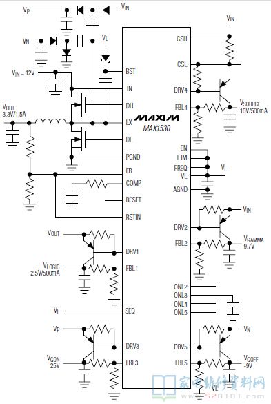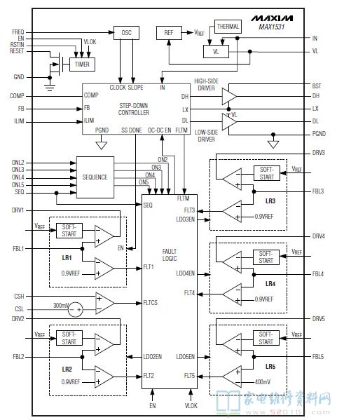 采用电流模式的控制结构,提供快速的负载瞬态响应和易于补偿功能。内部的线性稳压器提供MOSFET栅极驱动,也可提供较小的外部负载电流。