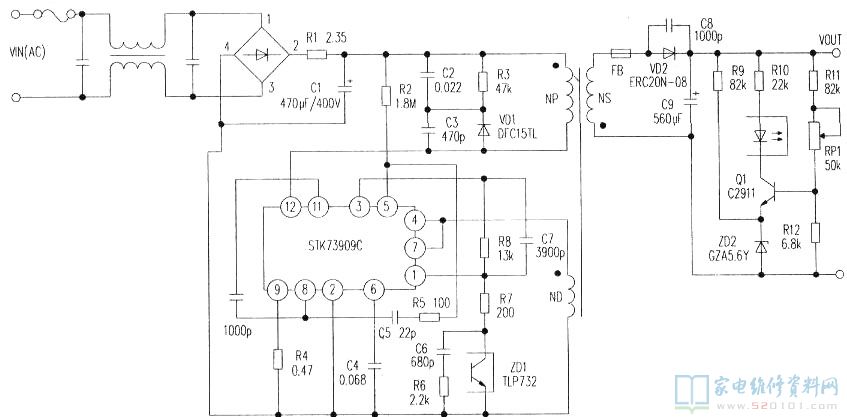 该应用电路可适应交流输入电压为170V—264V范围内,输出电压为直流115V。在应用电路中,R1(2.35Ω)为限流电阻,(5)脚外接的电阻R2(1.8MΩ)是启动电阻,并联在开关变压器初级绕组上的C2(0.022μF)、C3(470pF)、R3(47kΩ)、VD1(DFC15TL)组成缓冲阻尼电路,(9)脚外接的电阻R4(0.47Ω)为电流检测电阻,(6)脚外接的电容C4(0.068μF)为过流保护电平建立电容器,光耦VDl(TLP732)接电源厚膜块的(1)脚,可把输出电压的信息反馈到(1)脚内部,用于稳定输出电压。开关变压器次级电路与普通彩电取样放大电路相同。