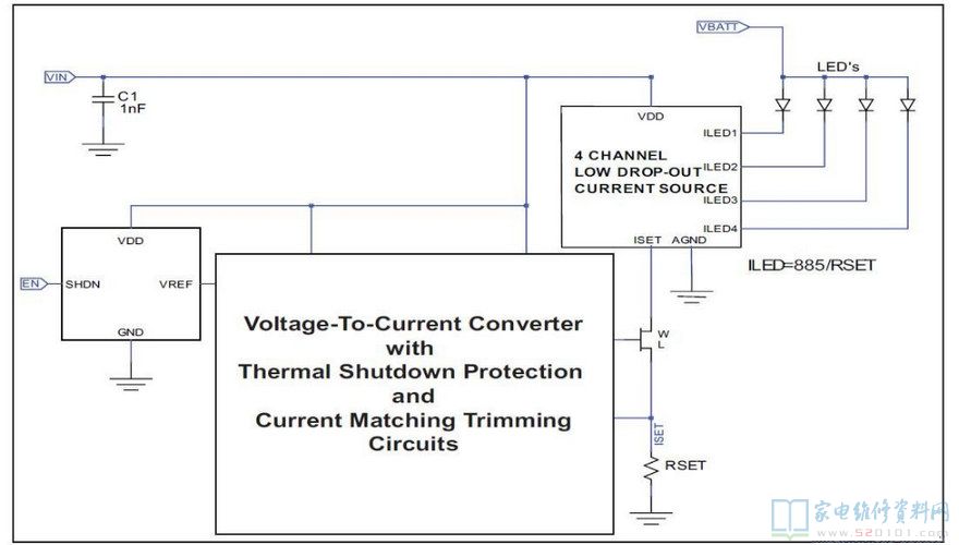 电路中的电阻RSET用来确定每一路输出的驱动电流,这个驱动电流与流过RSET的电流ISET相等。RSET=电流计算系数/ISET。