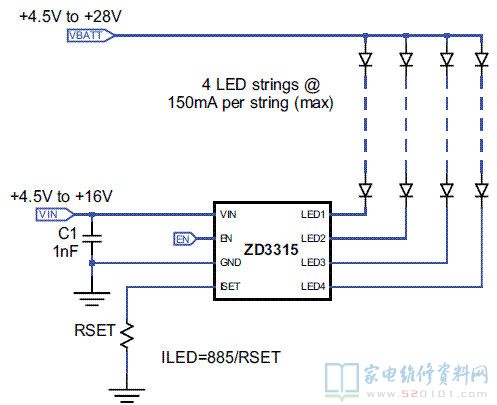 ZD3315的每个输出端的最大驱动能力为150mA,实际使用时应控制在125mA以下。现在有很多大功率LED的驱动电流超过了1A。为此ZD3315可以通过将单个ZD3315或多个ZD3315的输出端作并联连接,使驱动电流成倍地增加。
