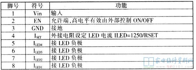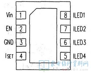 概述:ZD3315采用8脚封装。面积只有 2mmx3ram ,自带散热面,司借助印板铜箔散热,可驱动四路 LED。驱动电压4V~16V,在此范围内输入电压,可直接驱动1~4只LED(VF=3.5V)。该集成电路不需要外接电感线圈,只需外接一个电阻和一个电容就足够了,流过 LED 的电流和 LED 的点亮可以由外部控制。如果希望每一路能驱动 5 个以上的白色 LED 的话,除了要增加电源电压 VCC 之外,还必须在①脚 Vin 端串联电阻降压,以确保 Vin 在 16V 以下,串联电阻 R1 的阻值可用 R1=(Vcc-16V) / 7mA 来计算。例如当每路驱动 6 个 LED 时,电源电压应该选用 21V , R1 的阻值为 714 Ω。 EN 脚 ( ②脚 ) 是外部控制脚,只需将 EN 脚与 Vcc 连接就可以点亮 LED 。