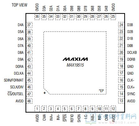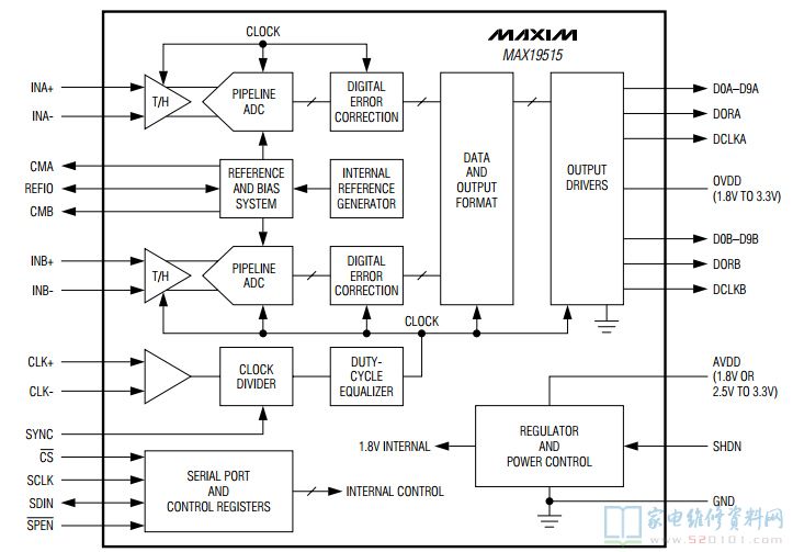 工作在1.8V电源下。此外,内置的自检测电压调节器可工作在2.5V至3.3V电压(AVDD)下。数字输出驱动器可工作在1.8V至3.5V的独立电源电压(OVDD)下。VAVDD = 1.8V时,每通道的模拟功耗仅为43mW。除了具有较低的工作功耗外,在断电模式下的功耗仅为1mW,待机模式下的功耗仅为15mW。