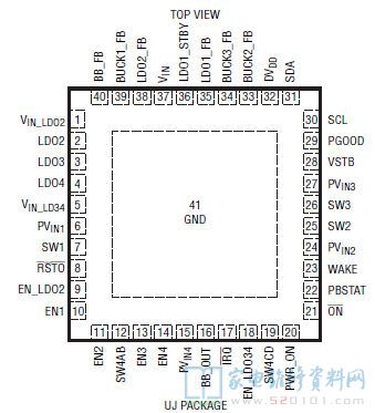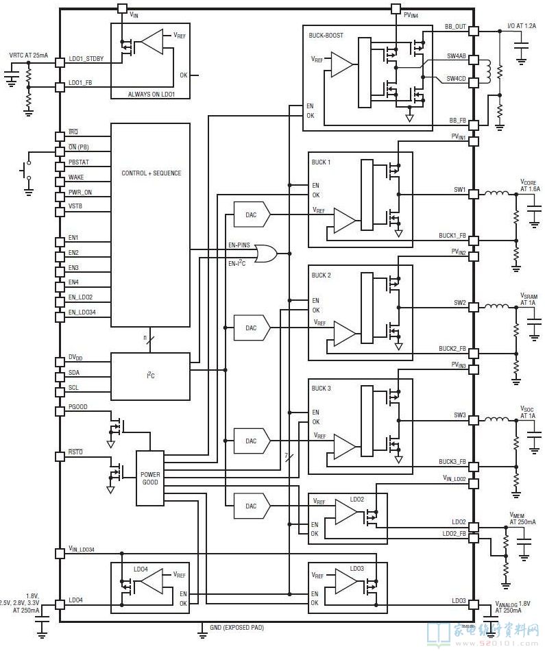通用 I2C 串行端口用来控制稳压器使能、输出电压值、动态电压调节和转换率、工作模式和状态报告。稳压器启动的排序操作通过按期望的次序将稳压器输出连接至使能引脚或通过 I2C 端口来完成。系统上电、断电和复位功能受控于按钮接口、引脚输入或I2C 接口。