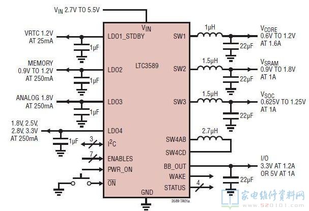 LTC3589 的单电感器、同步降压-升压型转换器产生一个 2.5V 至 5V 的用户可编程输出电压轨。该降压-升压型转换器运用了一种专有的开关操作算法,可在输入电压高于、低于或等于已调输出电源轨的情况下保持高效和低噪声运作。降压-升压误差放大器采用一个固定的 0.8V 基准,而输出电压由一个外部电阻分压器设置。突发模式工作的启动是通过 I2C 控制寄存器来实现的。无需外部补偿组件。