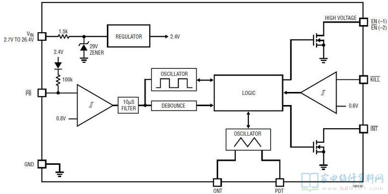 可在一个 2.7V 至 26.4V 的宽输入电压范围内运作,以适应多种输入电源。非常低的静态电流 (典型值为 6μA) 使 LTC2954 成为电池供电型应用的理想选择。