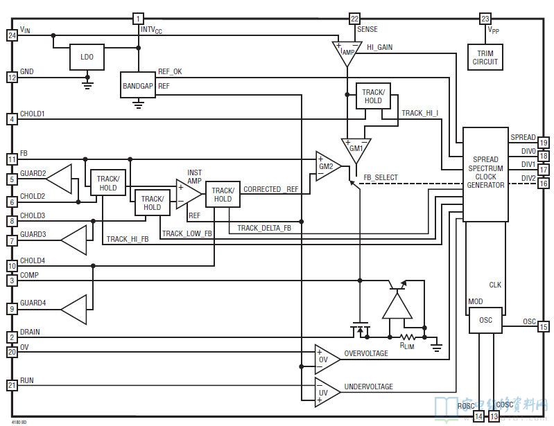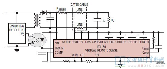 在采用隔离式或非隔离式电源的情况下,LT4180 可与采用任何拓扑的稳压器一起工作。输出校正通过调制输出并测量电压的逐步变化实现,电压的逐步变化是随电流的变化产生。通过位于负载端的电源旁路电容器,可以消除任何调制噪声。