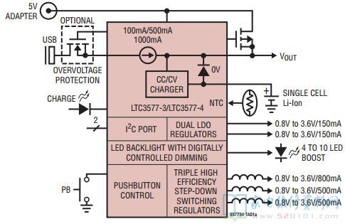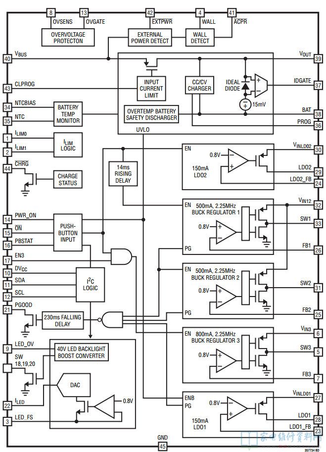 其他特点包括:一个具 I2C 控制型 60dB 亮度 (1000:1 调光范围) 和灰度等级控制能力的 40V 串联背面照明 10-LED 驱动器、具系统复位功能的按钮接通/关断控制、以及双路 150mA 电流限制 LDO。