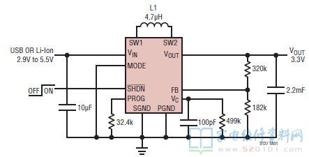 含有两个 N 沟道 MOSFET (分别为 140mΩ 和 160mΩ) 和两个 P 沟道 MOSFET (分别为 160mΩ 和 190mΩ),以提供高达 96% 的效率。该器件的可选突发模式 (Burst Mode®) 工作仅需要 35uA 的静态电流,停机电流低于 1uA,从而进一步延长了电池运行时间。就需要最低噪声的应用而言,可以配置为以固定频率 PWM 模式运行,从而降低了噪声和潜在的 RF 干扰。其它特点包括热过载保护和输出断接功能。